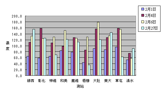 (4)臭氧監測站資料,僅有清水、大肚兩站,其濃度分佈約在40∼60ppb左右。