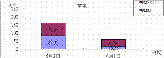 (4) 由21時煙線圖顯示,受到西風的影響,煙流擴散使污染物濃度降低,在台中、彰化地區濃度較低,濃度約在10 µg/m3 以下,而在南投一帶有污染物累積的現象,大部份濃度達60 µg/m3以上;等濃度分佈圖可看出草屯與台中市以西PM10濃度在75 µg/m3左右,其它中部地區為在50µg/m3 左右。