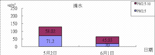 (1) 由3時之煙線圖可看出,煙流影響範圍在彰化以北地區西部沿海一帶,其煙流濃度在10 µg/m3左右,對中部地區影響不大;等濃度分佈圖顯示此時中部地區的PM10濃度約在25 µg/m3左右。