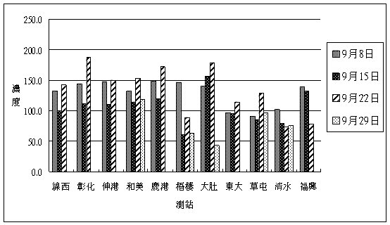 7.由9-33頁~9-36頁九月份中部地區環保署、台電空氣品質測站空氣污染指標統計表可以看出,中部地區在9月18日超過O3 PSI限值共有16站(16/19);中部地區在9月超過PM10限值共有9站 (9/28) ;中部地區在9月18日超過PM2.5限值共有16站 (16/17)。