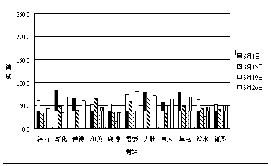 7.由8-33頁~8-36頁八月份中部地區環保署、台電空氣品質測站空氣污染指標統計表可以看出,中部地區在8月28日超過O3 PSI限值共有9站(9/19);中部地區在8月超過PM10限值共有0站 (0/28) ;中部地區在8月4日超過PM2.5限值共有13站 (13/17)。