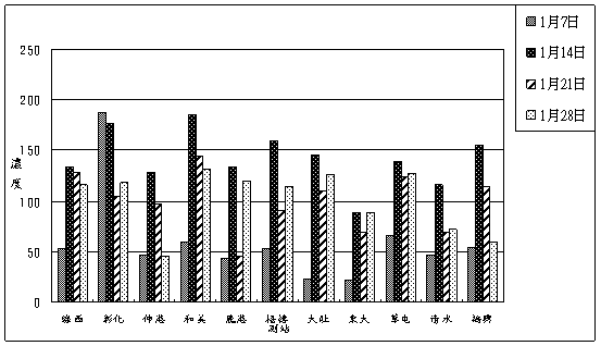 為進行每月空氣品質探討,首先將中部地區各測站分為台中縣(6站)、台中市(3站)、彰化縣(8站)、南投縣(4站)四個分區(含環保署、台電測站),再依據環保署標準將每個分區每天取最大前三站之平均,若PSI > 100,當天則判定為不良,PSI < 50則為良好,介於50至100之間則為普通。若當區當月中不良日數大於2天(環保署PSI > 100之百分比民國95年中期期程3 ﹪,30 × 3 ﹪≒ 1天),本月則判為不良;若本月普通日數大於優良日數本月則判斷為普通;若優良日數大於普通日數,本月空氣品質則判斷為優良。依據此標準一月份台中市、台中縣、彰化及南投地區的空氣品質屬於普通情況。