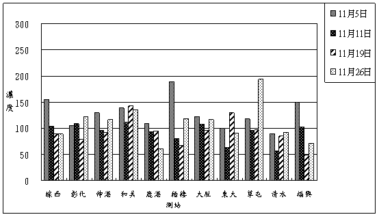 7.由11-33頁~11-37頁十一月份中部地區環保署、台電空氣品質測站空氣污染指標統計表可以看出,中部地區在11月5日超過O3 PSI限值共有8站(17/22);中部地區在十一月超過PM10限值共有15站 (15/28) ;中部地區在11月5日超過PM2.5限值共有17站 (17/17)。