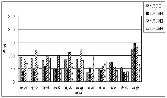 為進行每月空氣品質探討,首先將中部地區各測站分為台中縣(6站)、台中市(3站)、彰化縣(8站)、南投縣(4站)四個分區(含環保署、台電測站),再依據環保署標準將每個分區每天取最大前三站之平均,若PSI > 100,當天則判定為不良,PSI < 50則為良好,介於50至100之間則為普通。若當區當月中不良日數大於2天(環保署PSI > 100之百分比民國95年中期期程3 ﹪,30 × 3 ﹪≒ 1天),本月則判為不良;若本月普通日數大於優良日數本月則判斷為普通;若優良日數大於普通日數,本月空氣品質則判斷為優良。依據此標準四月份台中市、台中縣、彰化及南投地區的空氣品質屬於普通情況。