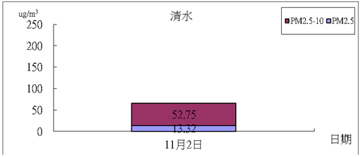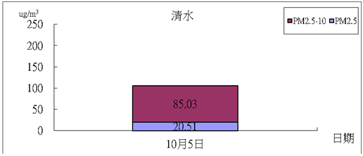 (1) 由3時模擬之煙線圖顯示,煙流濃度值約在5 µg/m3以下;由觀測之等濃度分佈圖可看出中部地區PM2.5的濃度在中部地區約在10~30 µg/m3左右。