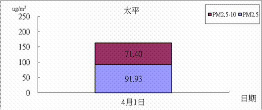 為進行每月空氣品質探討,首先將中部地區各測站分為台中市()(7)、台中市(3)、彰化縣(8)、南投縣(5)四個分區(含環保署、台電測站),再依據環保署標準將每個分區每天取最大前三站之平均,若PSI > 100,當天則判定為不良,PSI < 50則為良好,介於50100之間則為普通。若當區當月中不良日數大於1(環保署PSI > 100之百分比民國100年長期期程1.5 %31 ×1.5 %0.465),本月則判為不良;若本月普通日數大於優良日數本月則判斷為普通;若優良日數大於普通日數,本月空氣品質則判斷為優良。依據此標準四月份的空氣品質整個中部地區為不良狀況。