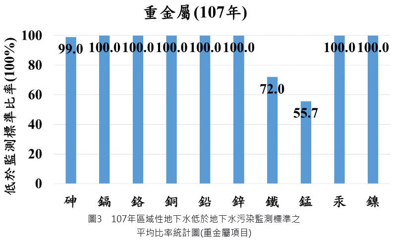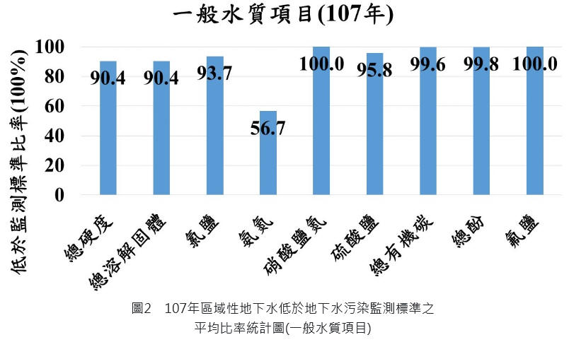 地下水一般水質項目與重金屬項目低於地下水污染監測標準比率如圖2~圖3,整體而言以錳與氨氮之比率普遍較低,然錳比率偏低為我國地質因素導致,而氨氮比率偏低為人為活動所影響。依水質項目由小而大排列為:錳(55.7%)、氨氮(56.7%)、鐵(72.0%)、總溶解固體(90.4%)、總硬度(90.4%)、氯鹽(93.7%)、硫酸鹽(95.8%)、砷(99.0%)、總有機碳(99.6%),其餘測項硝酸鹽氮、氟鹽、鎘、鉻、銅、鉛、鋅、汞、鎳等皆為100%。此外,23項揮發性有機物項目低於地下水污染管制標準比率皆為100%,顯示區域性地下水監測井皆符合揮發性有機物之標準。