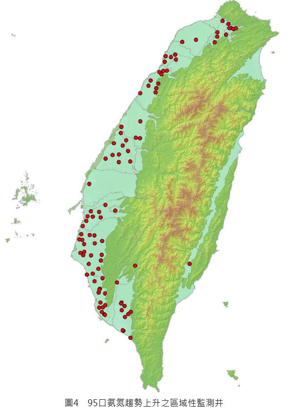 為掌握地下水氨氮濃度趨勢變化,環保署已彙整全國455口區域性監測井歷年地下水監測結果,以Mann-Kendall Test趨勢分析方法進行地下水氨氮濃度趨勢變化分析,並採較嚴格之95%信賴區間檢定結果,作為判定該測項是否隨時間呈現明顯趨勢之依據。以截至105年底地下水氨氮趨勢上升監測井數95口為衡量基準(監測井分布詳如圖2所示),歸納優先推動氨氮削減監測井重點名單,並作為跨單位地下水污染預防保護合作之基礎。