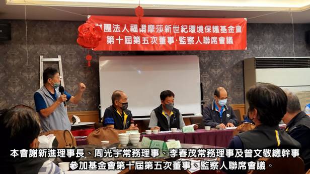 10/21張理事長暨尤信貿常務監事、洪邦乘常務理事、許森雄理事及魏總幹事參加福爾摩莎新世紀環保基金會第十屆第五次董事監察人聯席會議,本會張政義理事長榮獲常務董事,洪邦乘及許森雄榮獲董事,尤信貿榮獲監察人,基金會董事長由台中市公害防治協會陳國梁當選,常務監察人由台中市新環境促進協會趙俊恩先生當選。