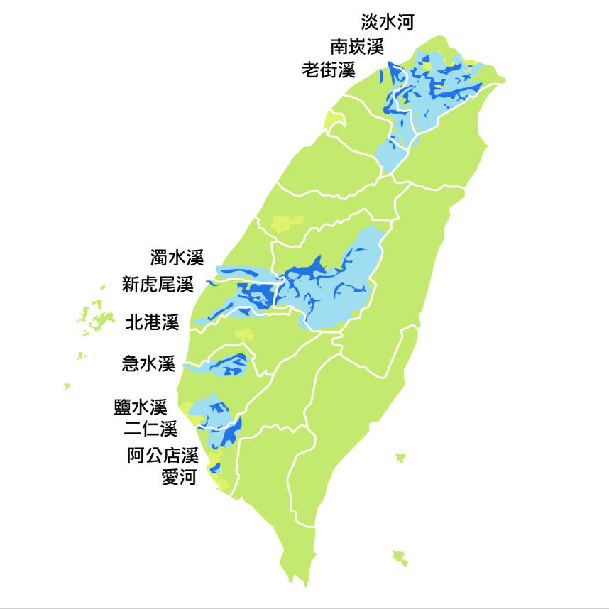 環保署為加速整治河川流域改善水體水質,選定淡水河、南崁溪、老街溪、濁水溪、新虎尾溪、北港溪、急水溪、鹽水溪、二仁溪、阿公店溪及愛河等11條重點河川污染整治工作(分布如圖1),以下為各重點河川整治成果: