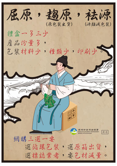 端午佳節即將到來,免不了有採購及送禮行為,為了減少不必要的包裝,民眾不論於店面或網路選購商品時應儘量挑選產品份量多且包裝材料少的商品,送禮避免過度包裝誠意又實在,滿滿的心意、少少的垃圾,禮數周到又可以很環保!循環署提供一個選購禮盒原則「一多三少」,即是產品份量多、包裝材料少、種類少及印刷少,鼓勵民眾「化繁為簡」,挑選包裝簡潔的禮盒,避免因送禮衍生出不必要的包裝垃圾,讓心意大打折扣。