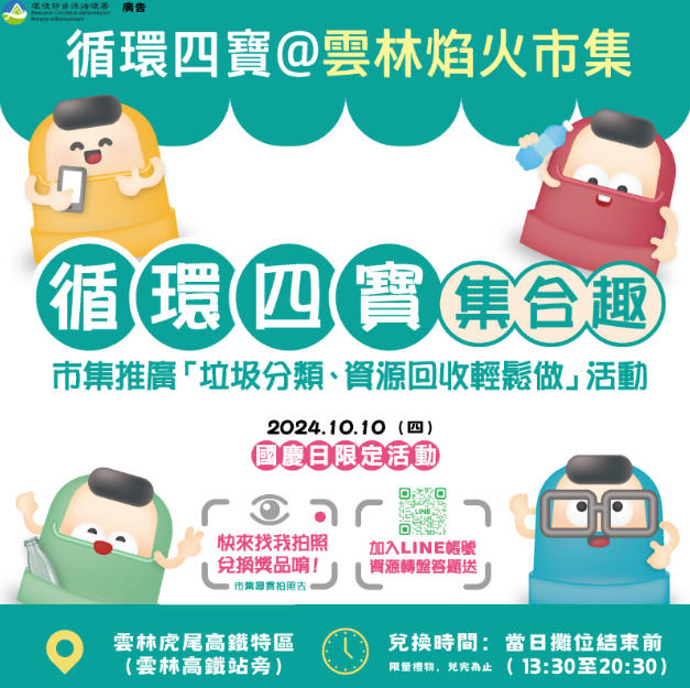 為促進大型活動落實資源回收再利用,環境部資源循環署特別帶著重新打造的外星寶寶2.0「循環四寶」,前進2024雲林國慶焰火市集,推廣日常生活、大型活動實踐資源回收的重要性。