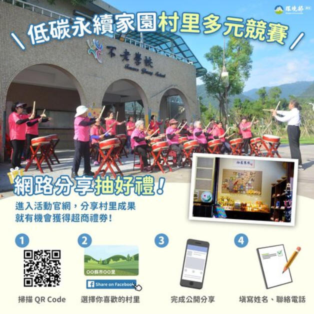 民眾前往活動網站閱覽各參賽村里的成果後,公開分享最有感的貼文內容於Facebook個人塗鴉牆,就有機會抽中200元禮券,活動期間自即日起至10月31日止,每天都可分享,分享次數愈多,中獎機率愈高,活動詳情請至活動網站查詢(網址:https://lcss.moenv.gov.tw),環境部歡迎大家一起來發掘各個參賽村里的減碳智慧,還有機會獲得好禮,希望幸運得主就是你!