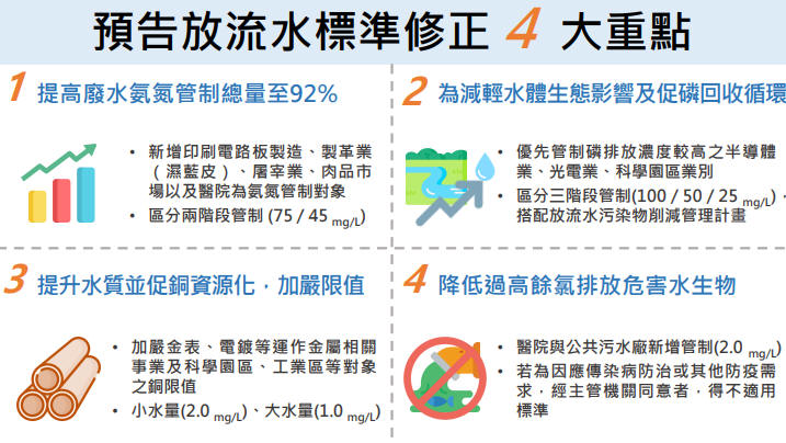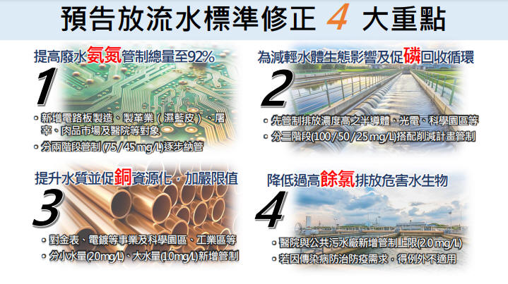 環境部為維護水體品質與推動污染物減量及管制,於113年8月27日預告修正「放流水標準」,增訂或加嚴氨氮、磷、銅及自由有效餘氯等項目之管制,預計事業廢水氨氮管制總量可由80%提升至92%,並減少高濃度磷排入水體之負荷,及持續降低特定流域銅濃度,提升水體品質並促進廢(污)水資源化推動。