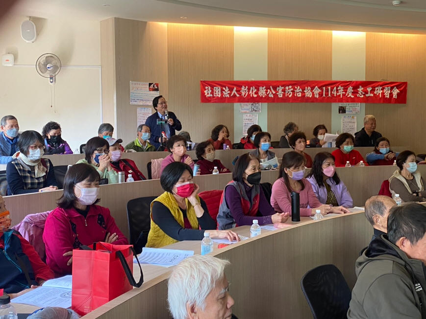 2/22 本會舉辦114年度志工研習活動,地點鹿江國際中小學哈佛講堂,共有理事14人,志工38人參加,邀請該校總務主任報告認識銀膠菊,承辦理事粘勝傑介紹本會沿格及志工講習, 魏鍾生漫談空氣污染,會後紅樓餐廳聚餐。
