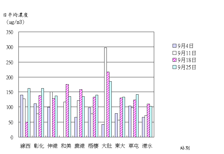 本月TSP之4次高量採樣計算結果如下圖所示,十個測站皆未超出國家環境空氣品質標準限值。