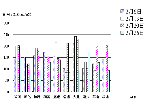 二氧化硫濃度在彰濱地區約10ppb,其餘地區約5ppb左右。(3) 2