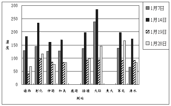 >80的天數明顯較多,共有七天;在PM10方面主要發生在1月1、3、14日,都有超過三站以上超出限值。