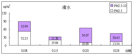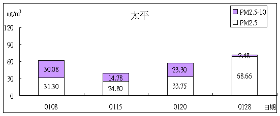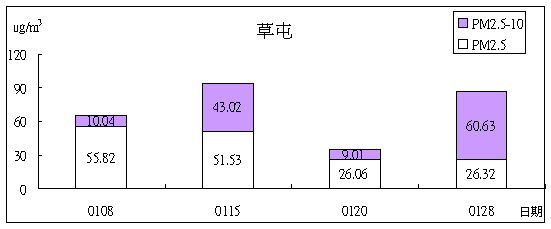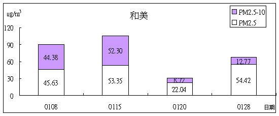 本月和美、草屯、清水、太平四站PM2.5之採樣結果。( 參考美國環保署的標準PM2.5日均值為60 mg/m3 )