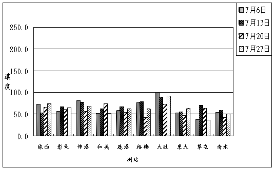 (4) 7-32頁,七月份的臭氧的小時最大濃度值於大里、竹山在70 ppb左右,其餘在60 ppb以下。