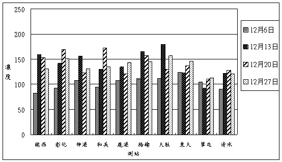 3.本月TSP之4次高量採樣計算結果如下圖所示,全部站次均符合國家環境空氣品質24小時小於250 mg/m3標準限值。