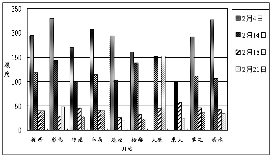 7.2-30~ 2-32頁二月份天氣型態及中部地區環保署、台電空氣品質測站空氣污染指標統計表可以看出,中部地區在215日超過O3 PSI限值共有7(2/19);在PM10方面主要也發生在24日,有14站超出限值(14/27)