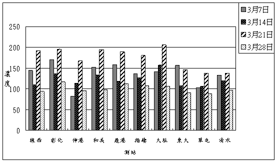 7.由3-30頁~ 3-32頁三月份天氣型態及中部地區環保署、台電空氣品質測站空氣污染指標統計表可以看出,中部地區在3月8日超過O3 PSI限值共有7站(7/19);在PM10方面主要也發生在3月27、18日,有13站超出限值(13/27)。