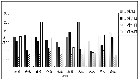 7.十一月份中部地區平均風場及污染物平均濃度分布之情況詳見11-32頁∼11-35頁。就平均風場而言,中部地區主要吹北北東風為主,而整月的污染物平均濃度敘述如下: