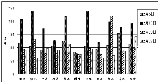 2-35頁二月份中部地區環保署、台電空氣品質測站空氣污染指標統計表可以看出,中部地區在2月22日超過O3