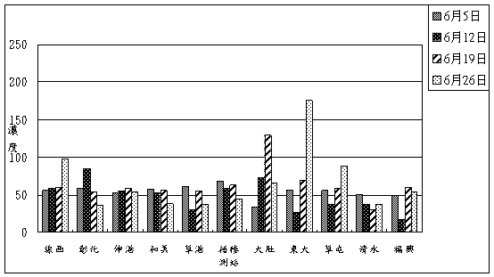 由六月份等濃度差值圖( 6-48頁 ~ 6-51頁)可看出2006年與2005年平均值之比較:由6-48頁之圖可知,六月份氮氧化物濃度在中部地區呈現持平或改善的情形,改善約3ppb左右,僅在清水地區呈現惡化約3ppb左右;由6-49頁之圖可以看出二氧化硫濃度在整個中部地區呈現平或改善現象,改善約1 ppb,而大度一帶呈現些微惡化,惡化幅度約3 ppb;由圖6-50頁之圖可看出PM10濃度在整個中部地區呈現改善,改善幅度約5 µg/m3以上;由6-51頁之圖中可看出臭氧小時最大值在中部以北地區呈現改善情形,改善幅度約為3 ppb左右,而彰化市、竹山及斗六地區呈現惡化的現象,惡化幅度約3~10 ppb。