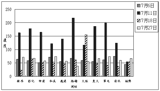 6.由7-33頁~ 7-35頁七月份中部地區環保署、台電空氣品質測站空氣污染指標統計表可以看出,中部地區在7月31日超過O3 PSI限值共有14站(14/19);在PM10方面主要發生在7月12日,有1站超出限值(1/28)。