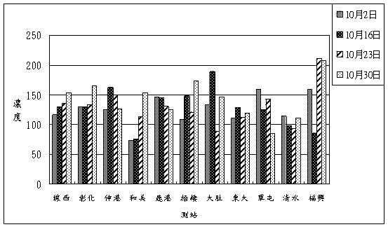 由十月份等濃度差值圖( 10-48 ~ 10-51)可看出2006年與2005年平均值之比較:由10-48頁之圖可知,十月份氮氧化物濃度在台中市、大肚、彰化縣及南投一帶呈現惡化的現象,惡化幅度約為3 ppb左右。由10-49頁之圖可以看出二氧化硫濃度在中部地區呈現持平的現象,僅草屯一帶惡化約1 ppb左右。由圖10-50頁之圖可看出PM10濃度在整個中部地區呈現惡化的現象,惡化約5 μg/m3左右。由10-51頁之圖中可看出臭氧小時最大值在中部地區呈現惡化現象,其惡化濃度約為10 ppb左右