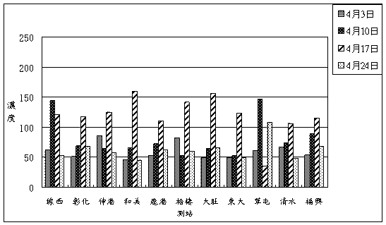 8.四月份中部地區平均風場而言,中部地區主要吹東北風為主,而整月的污染物平均濃度敘述如下: