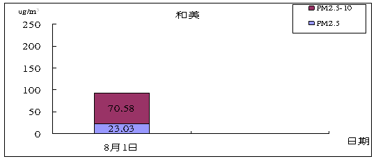 為進行每月空氣品質探討,首先將中部地區各測站分為台中縣(6)、台中市(3)、彰化縣(8)、南投縣(4)四個分區(含環保署、台電測站),再依據環保署標準將每個分區每天取最大前三站之平均,若PSI > 100,當天則判定為不良,PSI < 50則為良好,介於50100之間則為普通。若當區當月中不良日數大於2(環保署PSI > 100之百分比民國95年中期期程3 ﹪,30 × 3 1),本月則判為不良;若本月普通日數大於優良日數本月則判斷為普通;若優良日數大於普通日數,本月空氣品質則判斷為優良。依據此標準八月份台中市與彰化地區的空氣品質均屬於優良情況,而台中縣及南投地區屬於普通情況