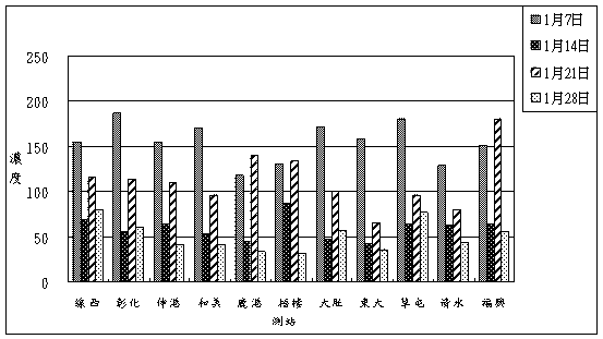 為進行每月空氣品質探討,首先將中部地區各測站分為台中縣(6站)、台中市(3站)、彰化縣(8站)、南投縣(4站)四個分區(含環保署、台電測站),再依據環保署標準將每個分區每天取最大前三站之平均,若PSI > 100,當天則判定為不良,PSI < 50則為良好,介於50至100之間則為普通。若當區當月中不良日數大於2天(環保署PSI > 100之百分比民國95年中期期程3 ﹪,30 × 3 ﹪≒ 1天),本月則判為不良;若本月普通日數大於優良日數本月則判斷為普通;若優良日數大於普通日數,本月空氣品質則判斷為優良。依據此標準一月份台中市、台中縣、彰化及南投地區的空氣品質均屬於不良情況。