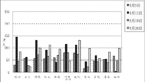 5-52頁為5月23日台中火力電廠及通霄火力電廠懸浮微粒貢獻比例圖。因兩電廠的煙流受北風影響,在苗栗沿海以南一帶之貢獻值達20 %左右。