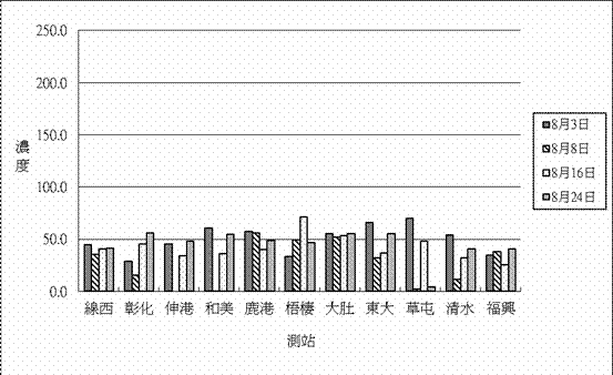 8. 八月份中部地區平均風場及污染物平均濃度分布之情況詳見。就平均風場而言,中部地區主要吹南風為主,而整月的污染物平均濃度敘述如下: