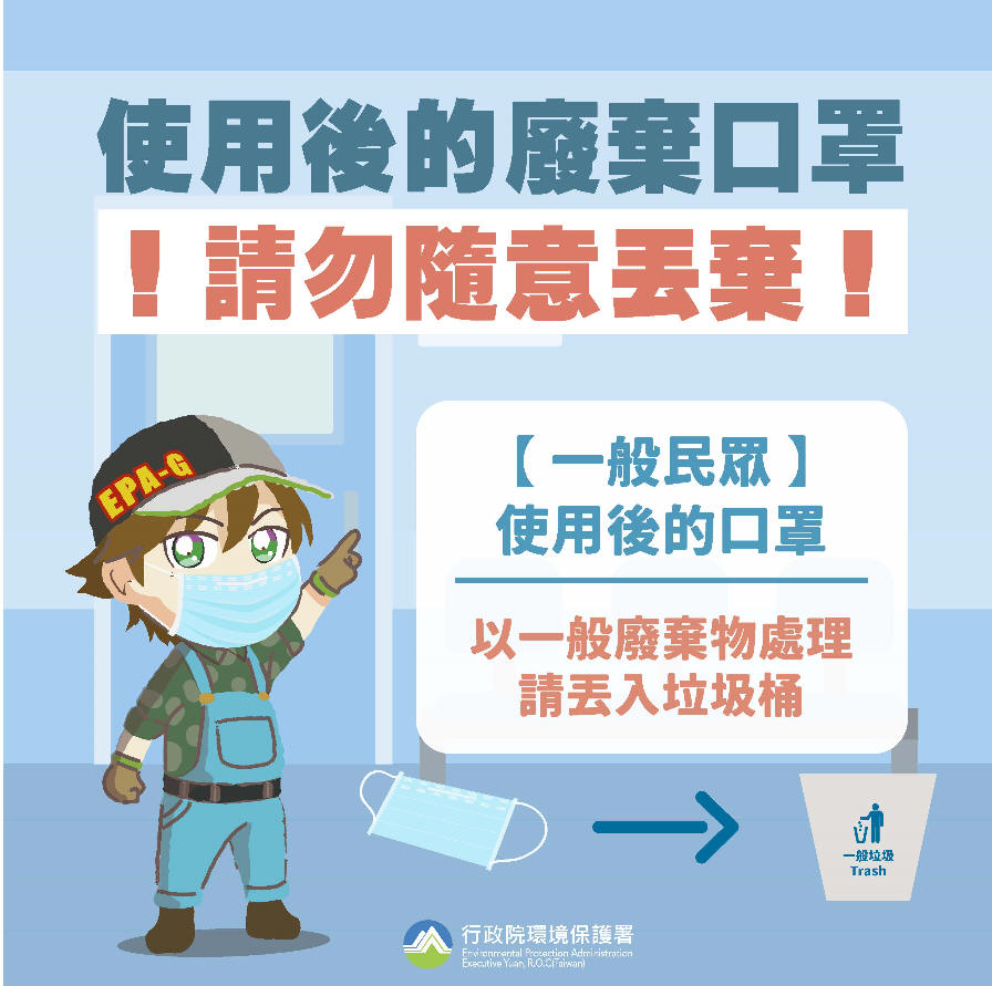 環保署說明,民眾如亂丟使用後口罩屬違反「廢棄物清理法」第27條規定行為,尤其目前為防疫期間,考量環境污染及健康影響,依照「違反廢棄物清理法罰鍰額度裁罰準則」加重認定污染及危害程度,該署已通函地方環保機關,經查獲亂丟口罩情形者,第1次將處罰3,600元,第2次以上將按次重罰6,000元,以遏阻此一違法行為;另易遭亂丟口罩地點(如醫院、捷運站、火車站、高鐵站,以及客運站出口等)之管理單位,亦應負起轄管範圍環境清潔之責任,倘經環保機關發現管理不善,將依違反「廢棄物清理法」第11條規定,處以1,200元以上6,000元以下之罰鍰。