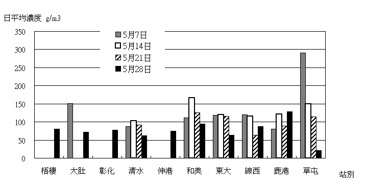 3.本月TSP4次高量採樣計算結果如下圖所示,與4月份相較污染較輕,多數在150μg/m3 以下。