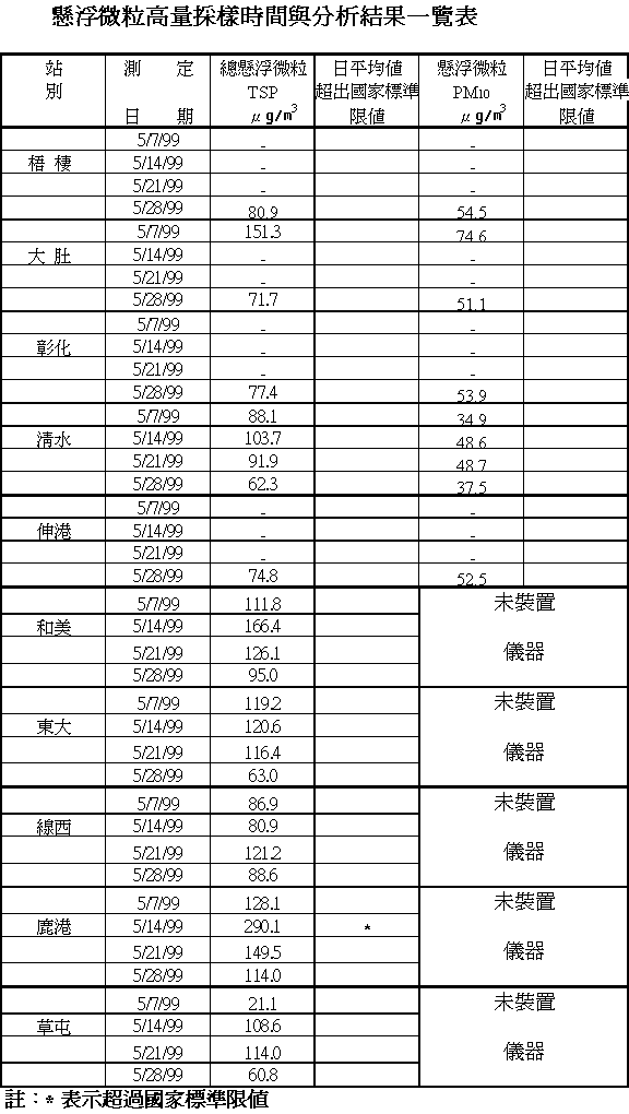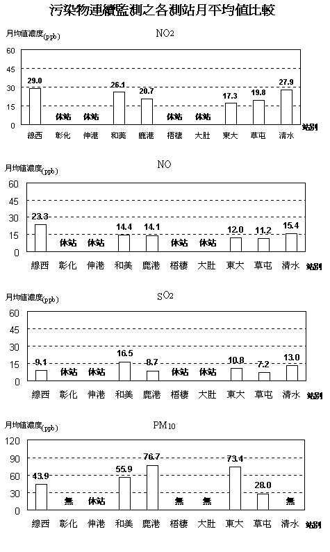 .本月份彰化、伸港、梧棲與大肚空氣品質監測儀汰舊換新中,故無數據。運轉中的6個測站其NOxSO2均合格,各污染物中以PM10污染較高,東大與鹿港站各有一日超限,其餘均符合標準。