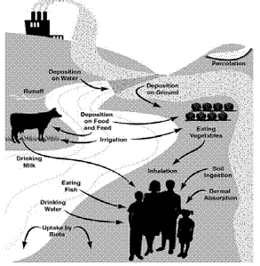 圖1.2、 環境中污染物排放和進入人體途逕示意圖