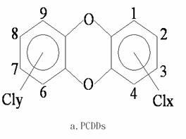 戴奧辛分為多氯二聯苯戴奧辛(Polychlorinated dibenzo-p-dioxins﹐簡稱PCDDs)和多氯二聯苯呋喃(Polychlorinated dibenzofurans﹐簡稱PCDFs)兩種,其中多氯二聯苯戴奧辛有75種,多氯二聯苯呋喃有135種,共計210種;其多氯二聯苯戴奧辛、多氯二聯苯呋喃的基本結構和同樣數目之氯鍵結的同分異構物分別如圖2.1和表2.1所示。由圖2.1可知,戴奧辛是由兩個苯環中間鍵結氧並由氯鍵結於苯環上而形成的化合物,其中多氯二聯苯戴奧辛和兩個氧鍵結,多氯二聯苯呋喃和一個氧鍵結,苯環上1 ~ 4和6 ~ 9的位置都可鍵結氯。由表2.1可發現戴奧辛的同分異構物較多者多為3 ~ 5氯。戴奧辛中氯的數目和鍵結位置的不同將會決定戴奧辛本身的特性,如沸點、蒸氣壓和溶解度等;通常氯數越多沸點越高、蒸氣壓越低、溶解度越低且穩定性越高,戴奧辛的沸點和蒸氣壓也會影響本身於氣固相的分布。通常氯數越高者因蒸氣壓越低,越不易以氣態存在;反之,氯數越少者,越容易以氣態存在。因此在常溫採集之戴奧辛發現大部分多氯則存在於粒狀物上,少氯則多以氣態存在,一般戴奧辛於常溫下都以無色的結晶體存在。