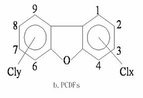 圖2.1、多氯二聯苯戴奧辛(Polychlorinated dibenzo-p-dioxins)和多氯二聯苯呋喃(Polychlorinated dibenzofurans)基本結構示意圖