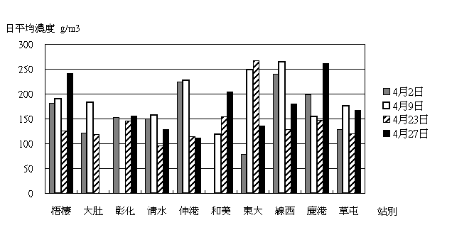 3.本月TSP之4次高量採樣計算結果如下圖所示,彰化與清水TSP污染較低,東大與線西污染相對較高。
