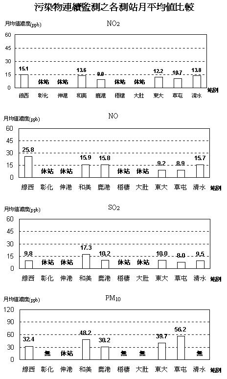 1.本月份彰化、伸港、梧棲與大肚空氣品質監測儀汰舊換新中,故無數據。運轉中的六個測站其NOxSO2 均合格,各污染物中以PM10污染較高,其中僅草屯有超限次數發生。