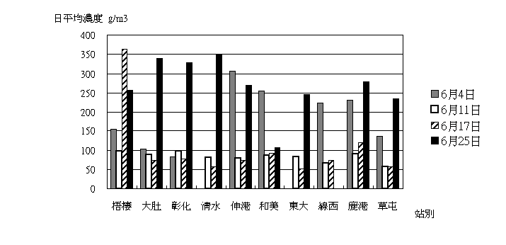 3.本月TSP4次高量採樣計算結果如下圖所示,東大與線西TSP污染較低,梧棲與伸港污染相對較高。